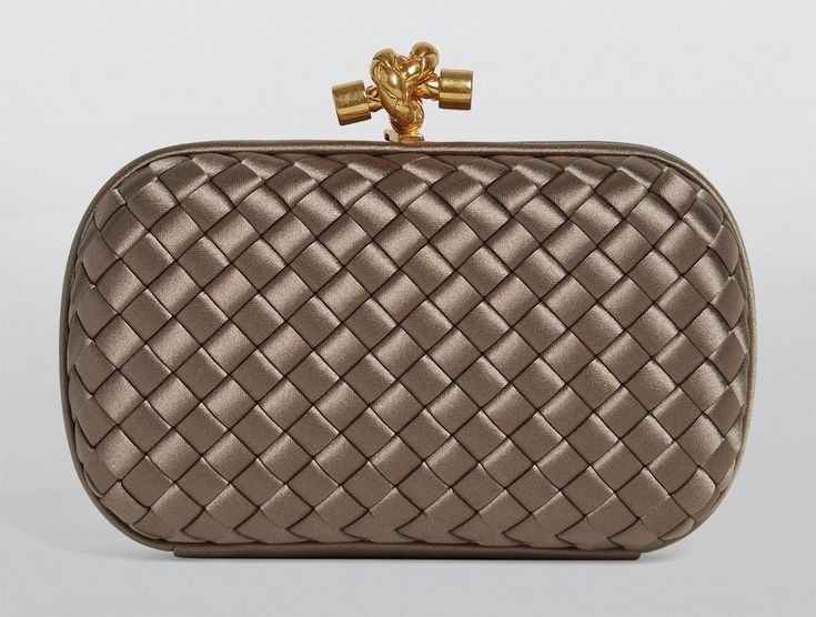 Op zoek naar een chique, fashionable avondtas? Dan is deze satijnen geweven Bottega Veneta intrecciato knot clutch een hele goede optie. . Bijzonder aan deze tas is het kenmerkende gevlochten patroon (intrecciato) van satijn waar het modehuis Bottega Veneta om bekend staat. De knot clutch sluit met de matbronzen gouden knoop en is afgewerkt met slangenleren details.