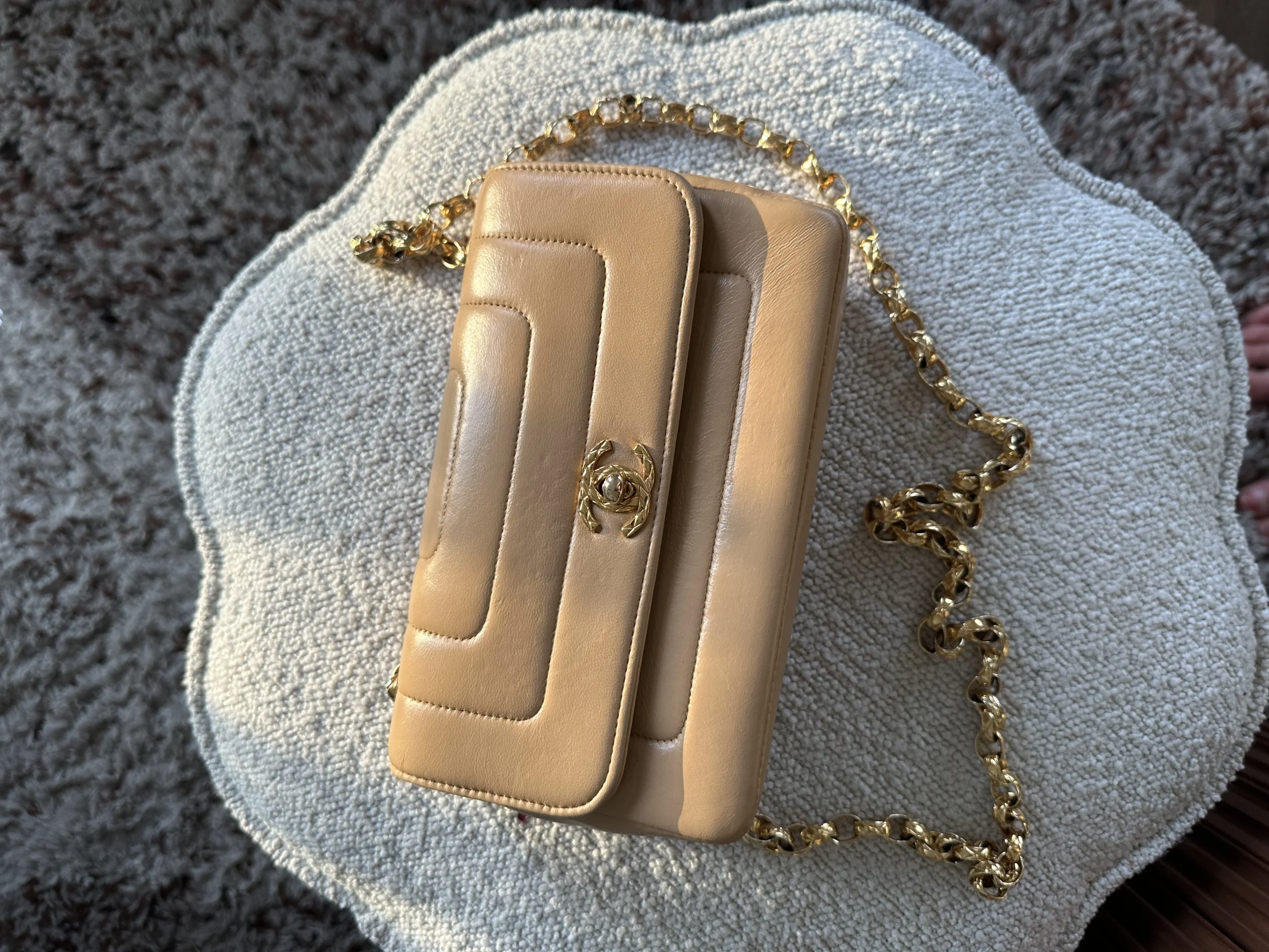 Wow, deze beige vintage Chanel flap tas is zeer zeldzaam en heeft een bijzondere quilted gouden CC logo sluiting. Deze vintage Chanel tas komt uit de jaren ’90 en straalt klasse uit. Het formaat van deze Chanel tas is ideaal voor een avondje uit en de bewerkte gouden ketting maakt de tas helemaal af.