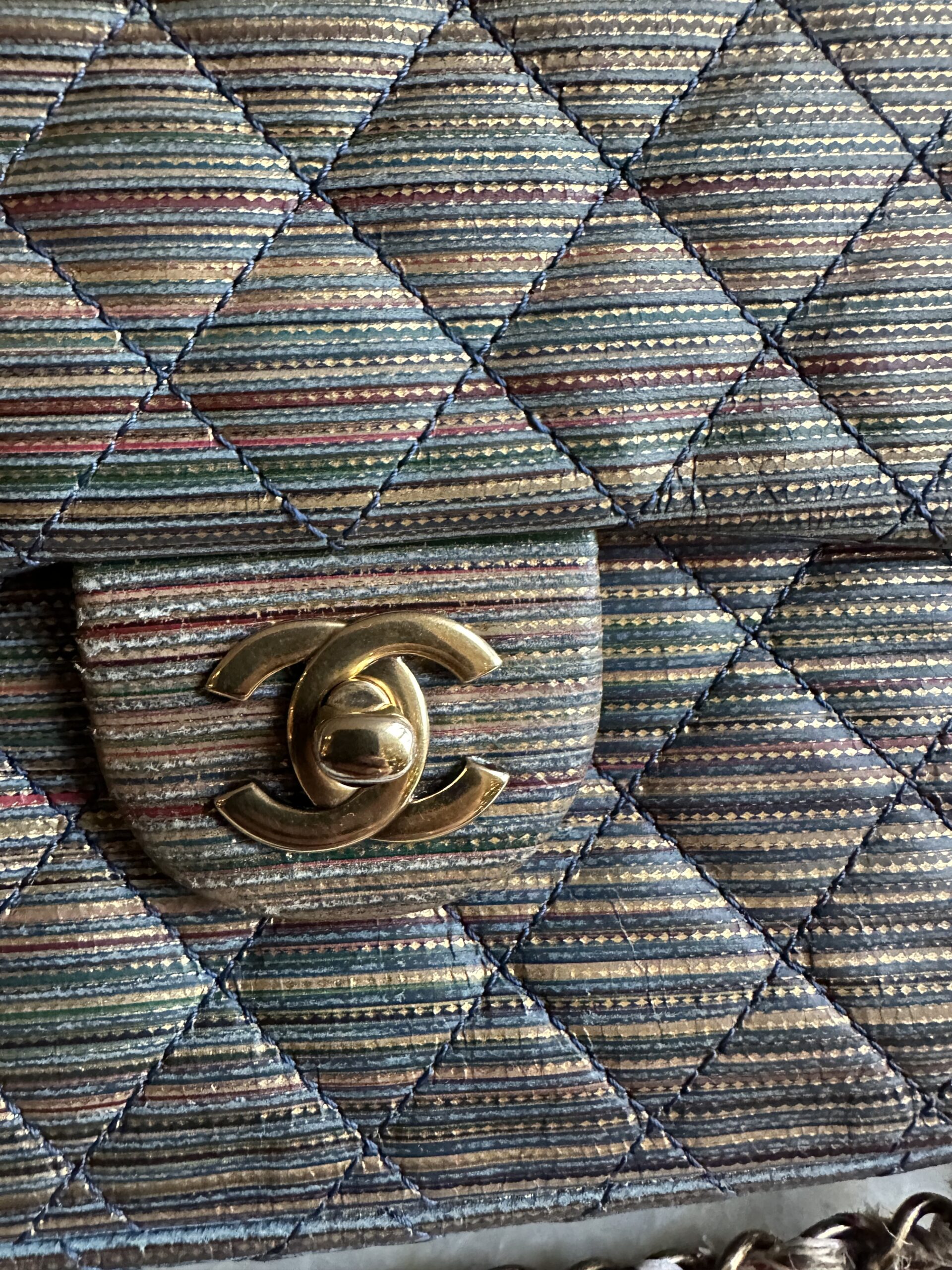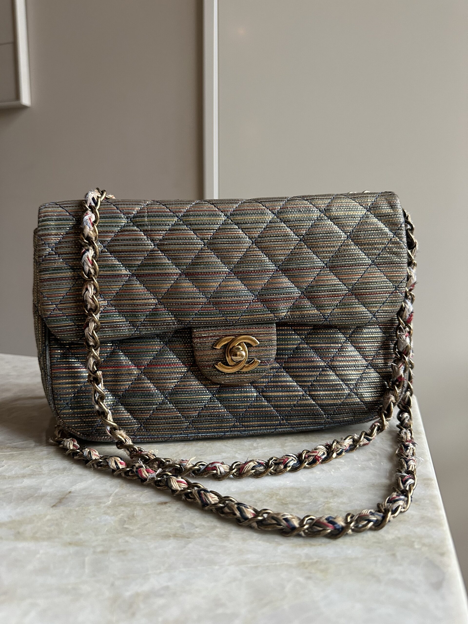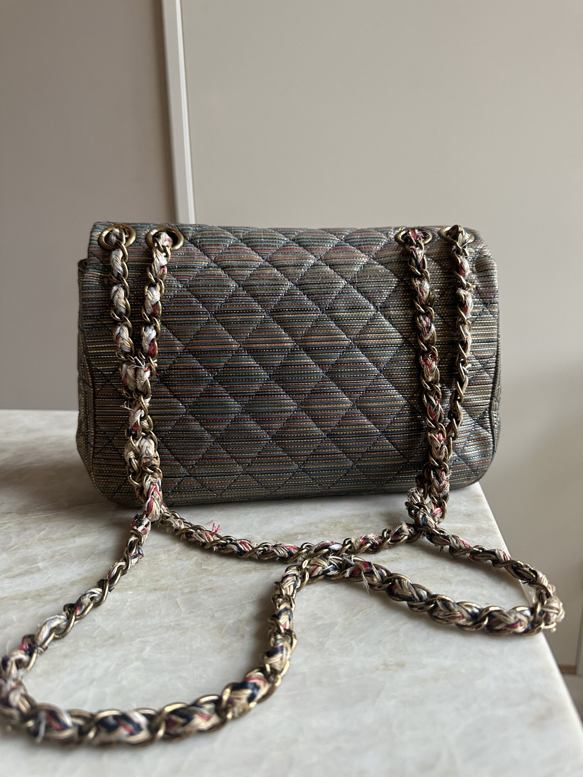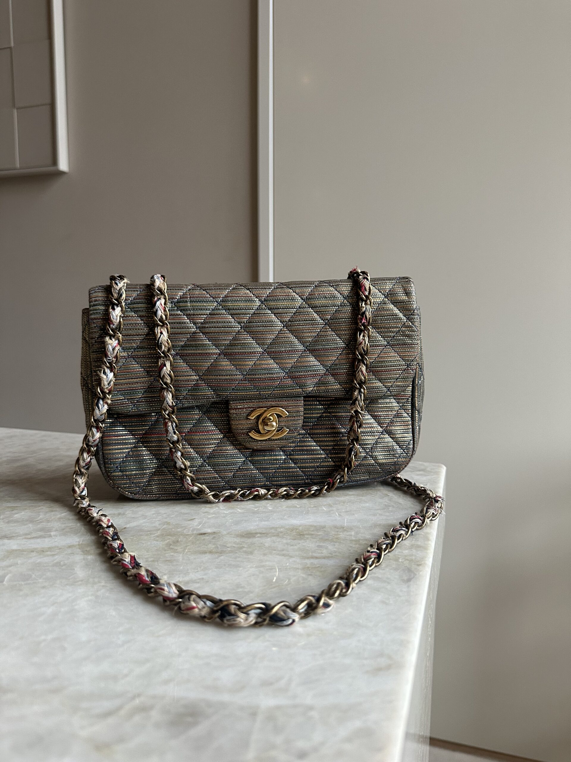 Deze zelfzame pre-loved Chanel classic flap tas uit 2005/2006 is echt een statement piece. De geweven multicolor stof met subtiele metallic glans geeft de iconische Chanel-tas een speelse, unieke twist — terwijl de gouden CC-sluiting en ketting zorgen voor die onmiskenbare classy touch.