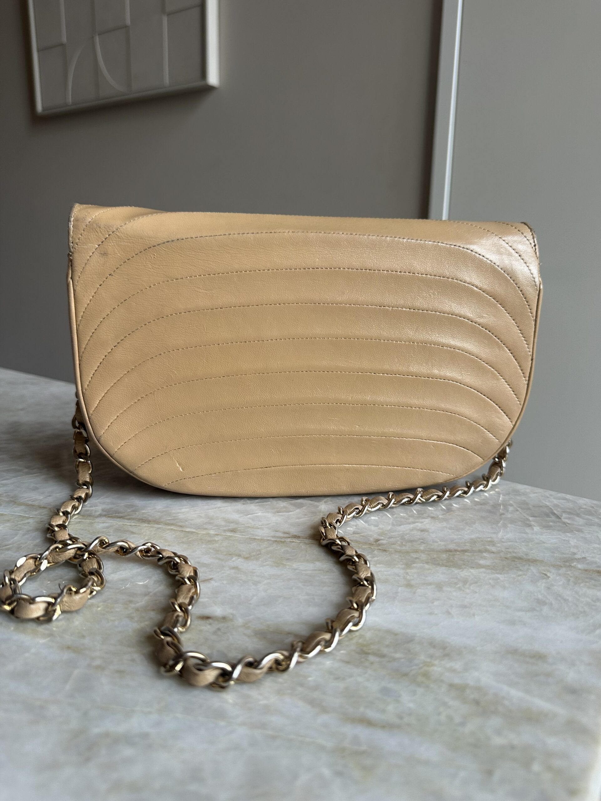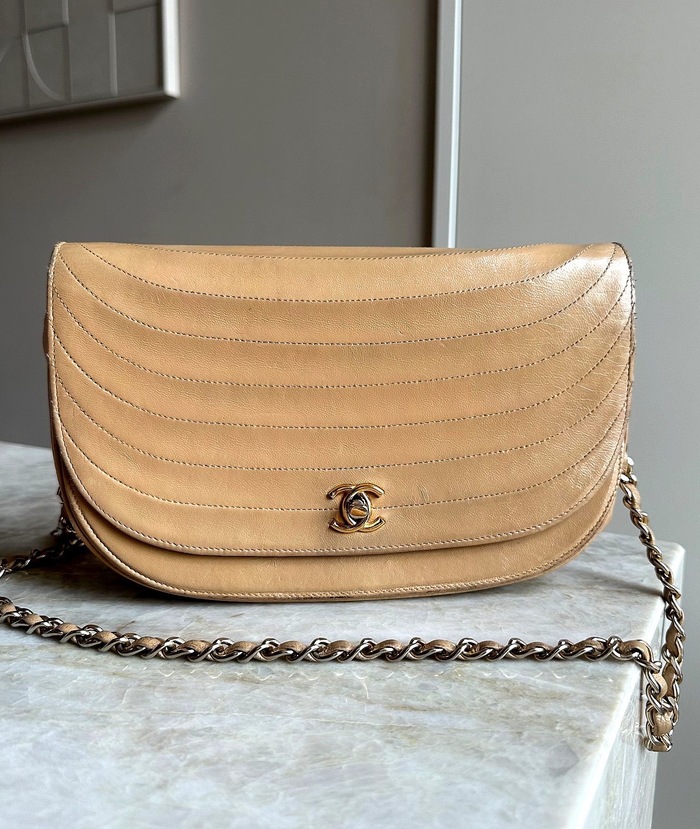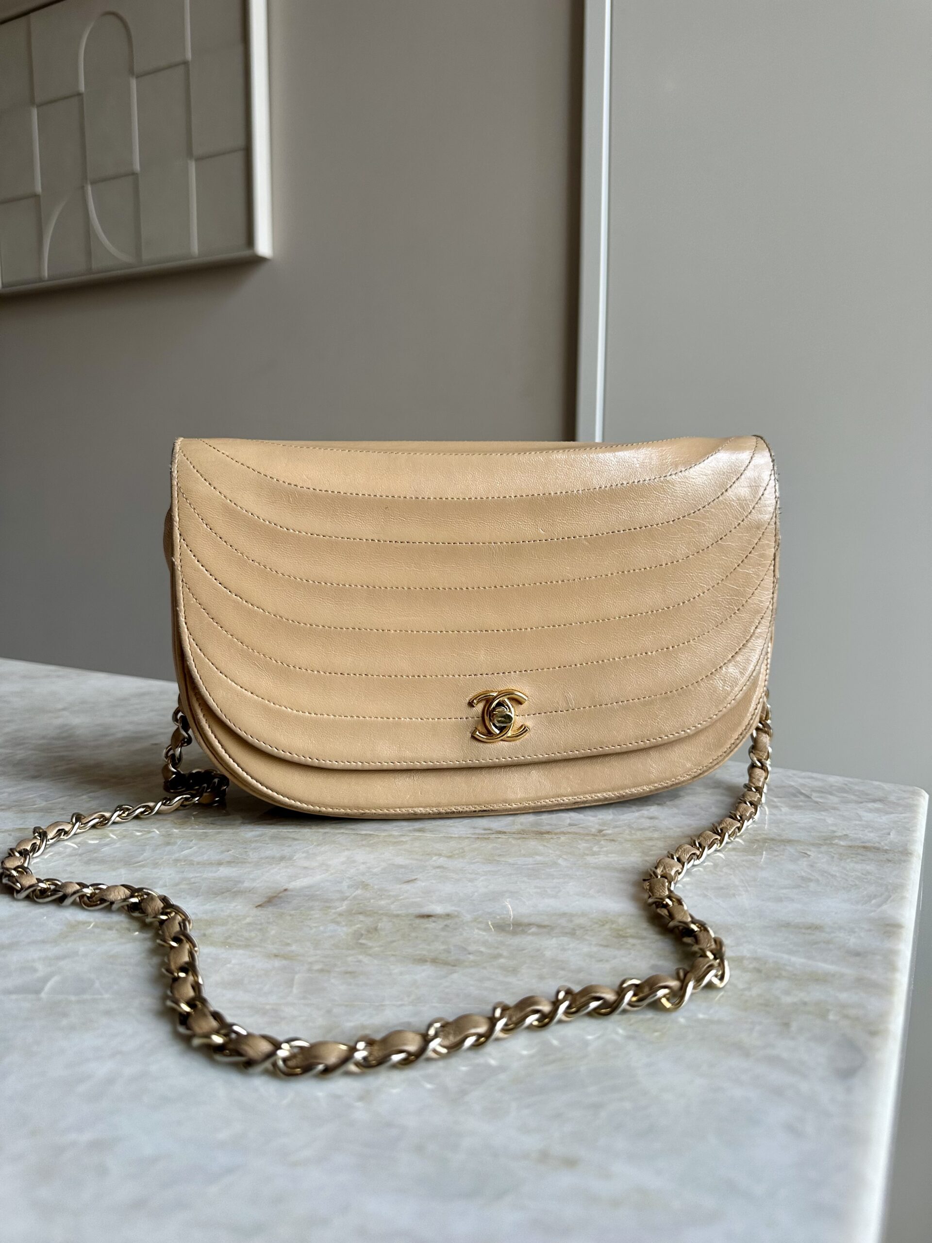 Een vintage Chanel tas onbetaalbaar? Niet als je voor een designertas huren kiest, de Chanel half moon crossbody tas in beige huur je al vanaf €119