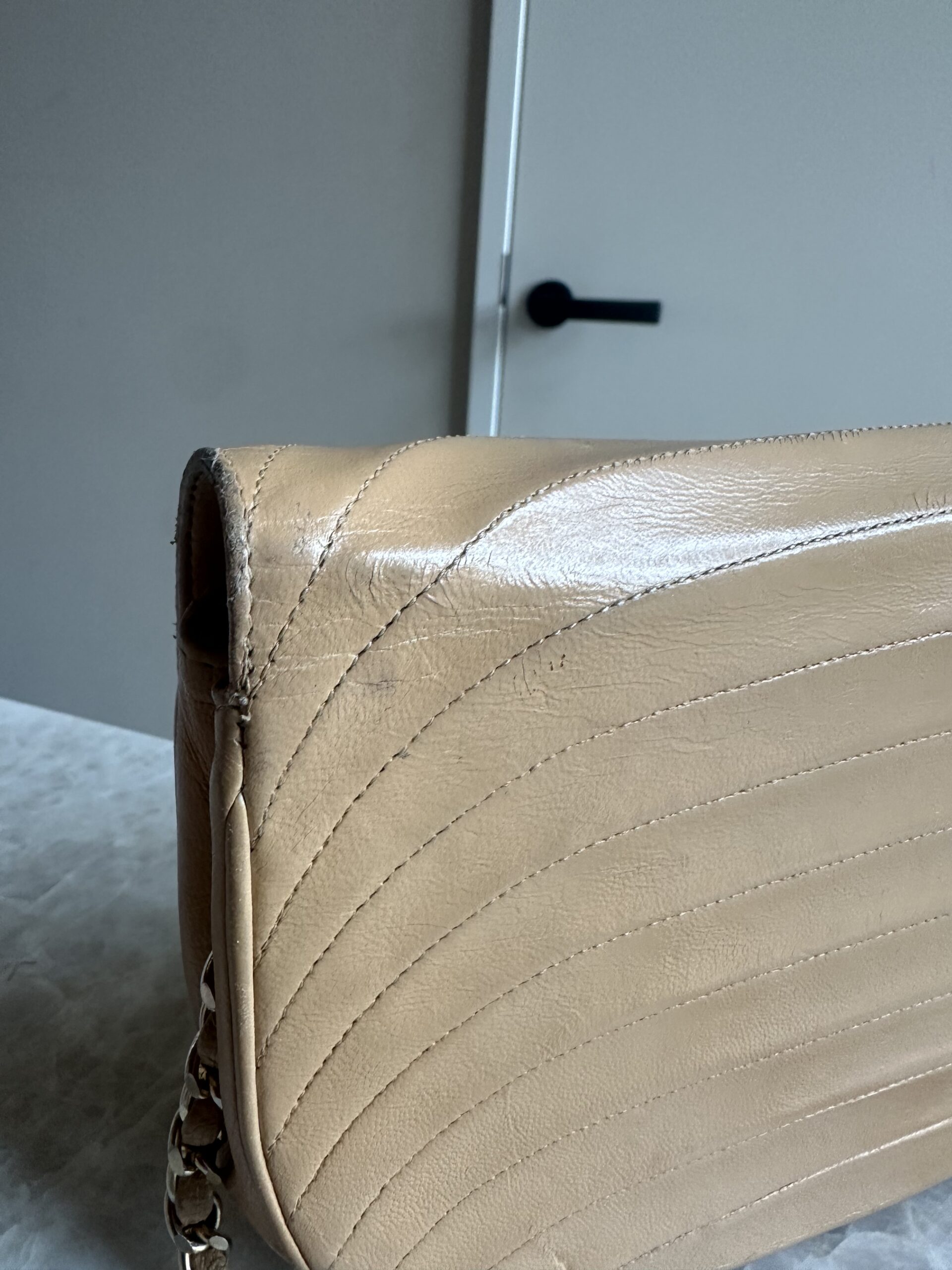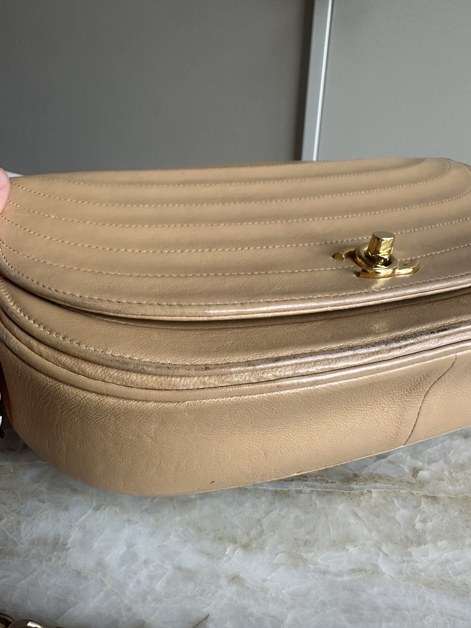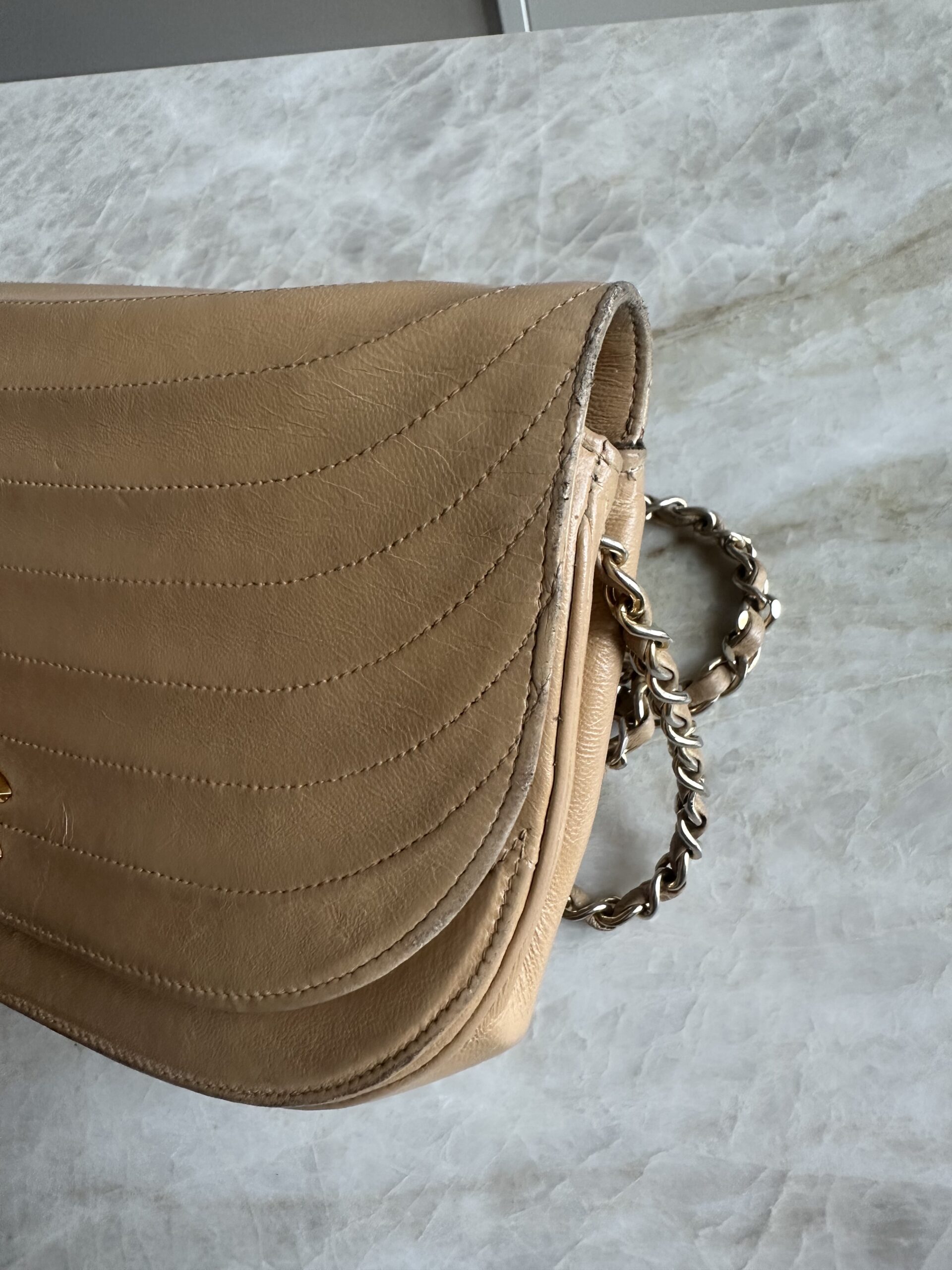 Deze beige Chanel half moon tas heeft wel gebruikssporen op het leer en de achterkant van de tas is lichtjes verkleurd.