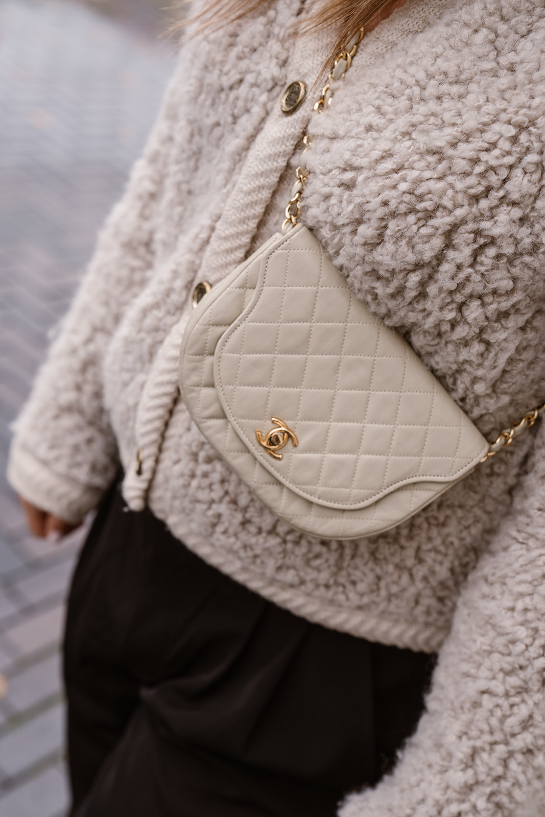 Wat een cutie is deze vintage Chanel mini flap tas van beige lamsleer. Deze beauty met de herkenbare CC turnlock sluiting komt uit de jaren ’80 en is in goede vintage staat. Door het kleine formaat van de Chanel mini flap tas is het een perfect tasje voor avond, events of huwelijken. Je telefoon en lipstick passen in deze tas.