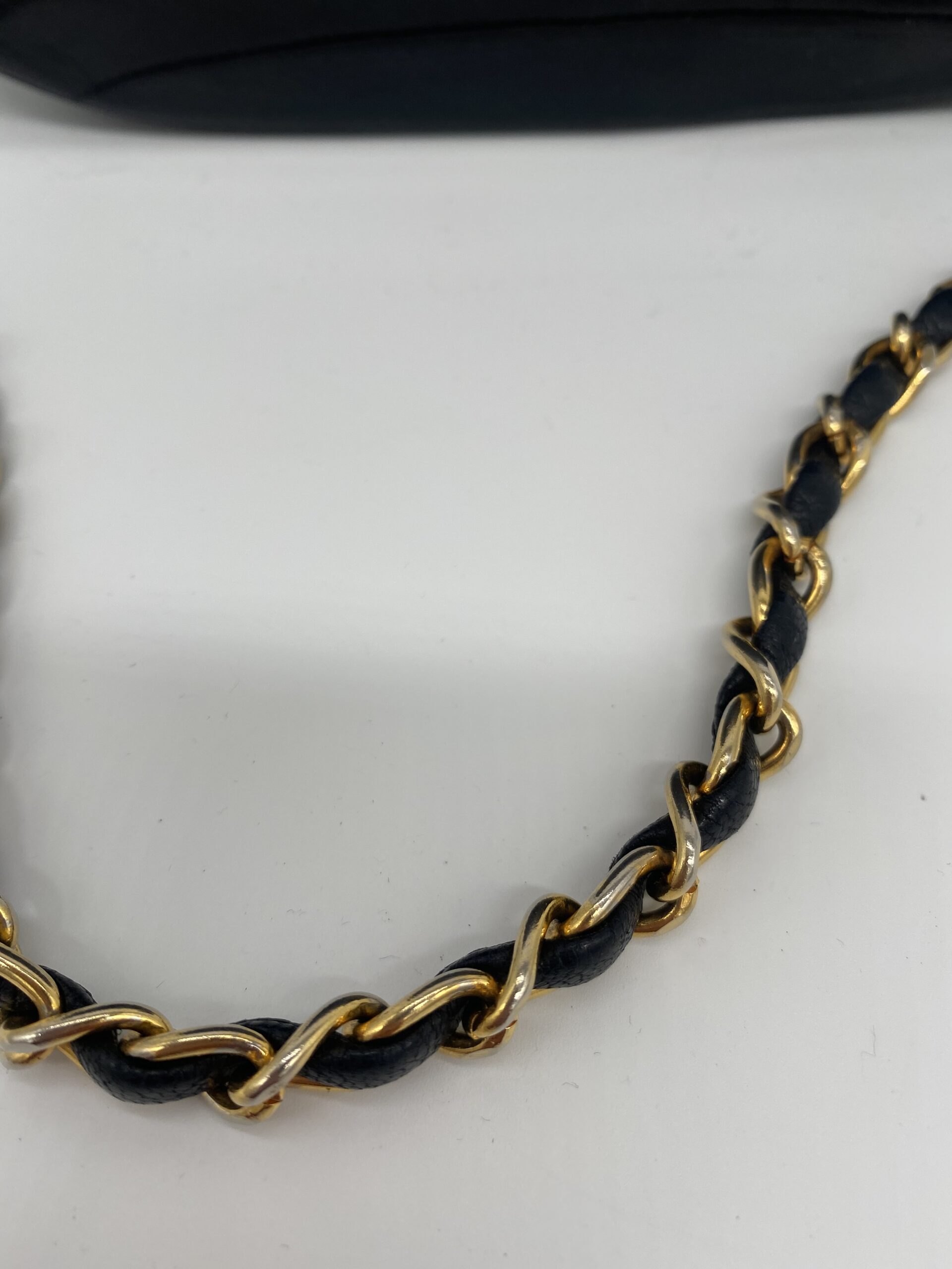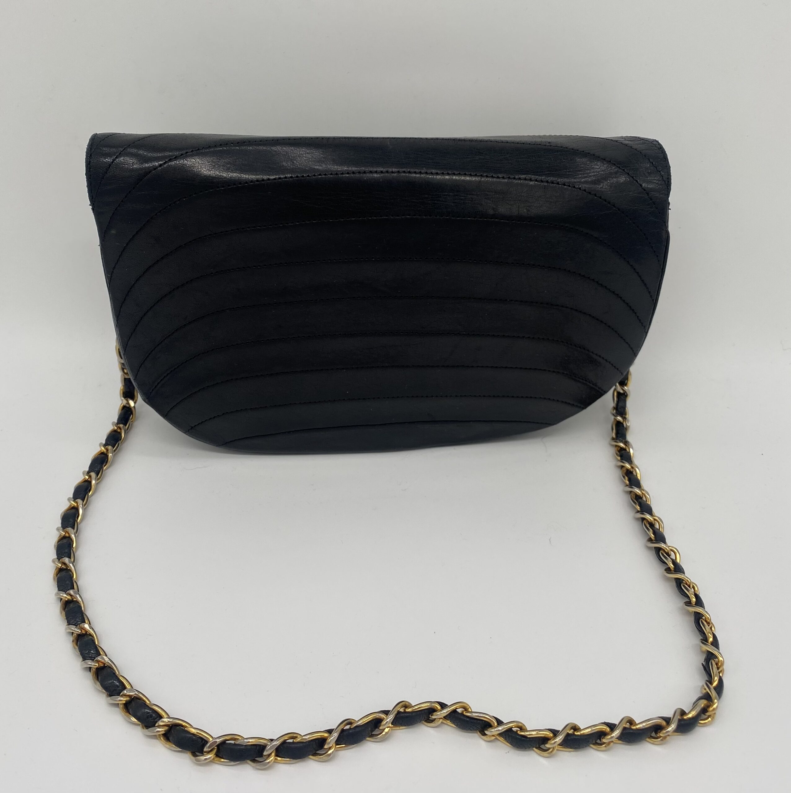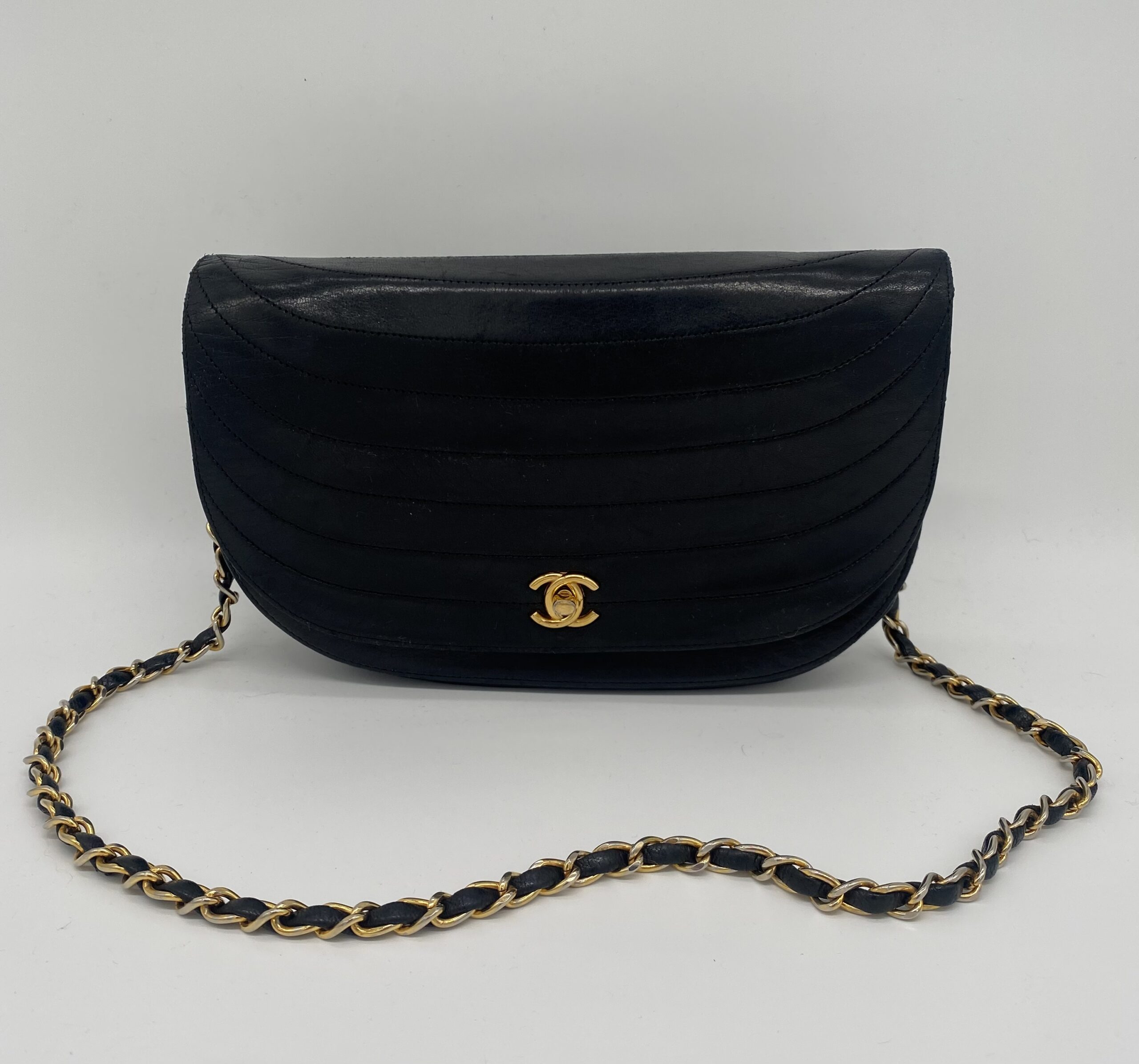 Wat een parel is deze vintage Chanel tas. Dit is Chanel vintage ‘half moon’ zwarte flap tas uit de jaren 80 met ketting. Deze unieke tas is een echt collectors item met de originele 24k gold plated hardware. Wij hebben de Chanel half moon schoudertas ook te huur in wit leer.