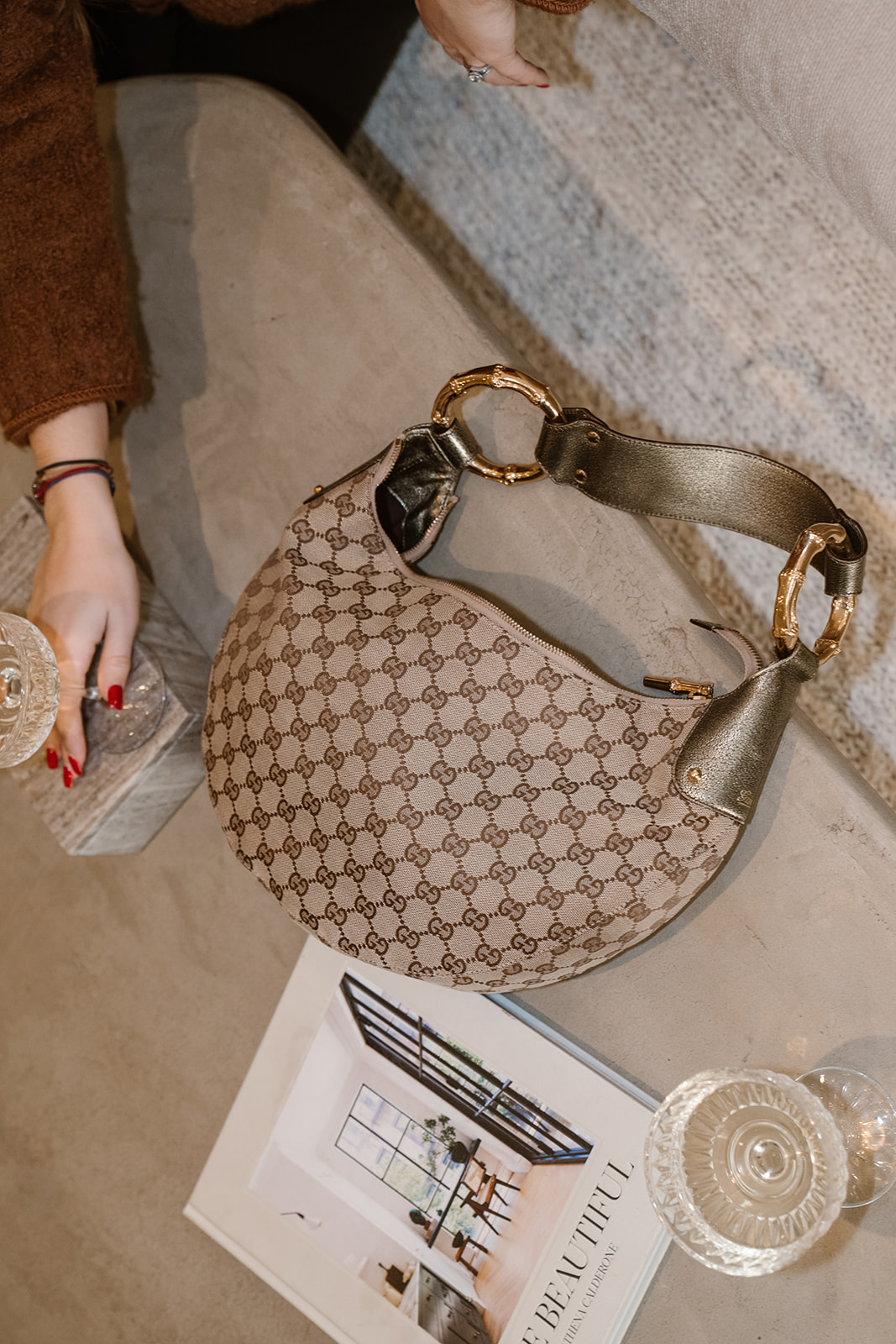 Hoe cool is deze vintage Gucci tas, helemaal 70s vibes met de bamboo details. Deze vintage Gucci tas heeft het bekende GG monogram logo en het halve maan achtige model is nu heel populair. Je draagt deze Gucci hobo tas over je schouder en hij is verrassend ruim qua formaat. Met dit vintage model spot je niemand anders. Het formaat van deze Gucci tas is verrassend ruim, er past veel in.