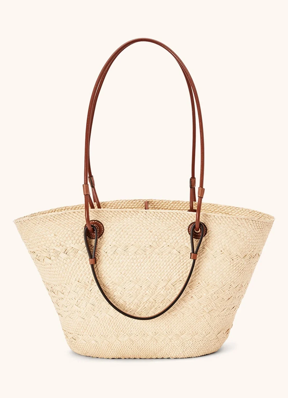 Meet de strandtas van dit seizoen; de mega populaire Loewe anagram basket bag. Dit is het medium formaat en deze tas heeft het herkenbare Loewe logo in cognackleurig leer. Deze Loewe anagram strandtas is handgeweven van Icara palmbladeren in Spanje. Door de lange en korte hengsels kun je de tas aan je arm of over je schouder dragen.